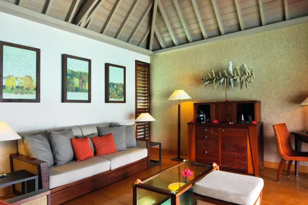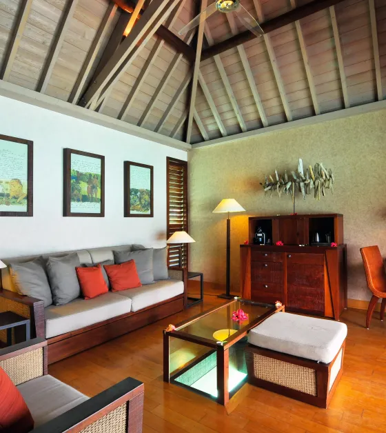 | Emerald Overwater Villa | POLUPANSION. oko 65 m2, na stupovima na vodi. Na bungalovu se nalazi veliki panoramski prozor, odvojeni dnevni boravak i spavaća soba, walk in ormar, velika kupaonica s kadom, wc, odvojeni tuš, sušilo za kosu, ogrtač, 2 TV-a (flat screen), DVD player, telefon, WiFi, glačalo, klima, stropni ventilator, mini bar, kuhalo za kavu/čaj, sef, na podu se nalazi stakleno dno za promatranje podvodnog svijeta, velika privatna terasa za sunčanje s vanjskim tušem i izravan pristup laguni. Vile imaju pogled na plažu. | od 56.800,00 kn |