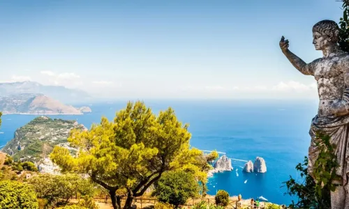 Doručak. Fakultativni izlet brodom na otok Capri, otok iznimne ljepote, stjenovite obale i prepun tropske vegetacije. Po dolasku u luku Grande Marina, mogu se vidjeti arheološke ruševine Palazzo a Mar iz doba Augusta ili Tiberija.. Razgled gradića Caprija: srednjovjekovne kuće i Piazzetta, Certosa di San Giacomo, Giardini di Augusto… Slobodno vrijeme za uživanje u šarmantnom ozračju ovog prekrasnog otoka, kupovinu suvenira, odličan capuccino, izvrsnu pizzu ili fini talijanski aperitiv. Vožnja do gradića Anacaprija, šetnja i slobodno vrijeme za odlazak na vidikovac Belvedere Migliera. Poslijepodne nastavak vožnje brodom do grada Amalfi, čija je obala pod zaštitom UNESCO-a kao svjetska baština zbog slikovite ljepote i raznolikosti naselja. Šetnja do katedrale Sv. Andrije poznate zbog upečatljivog stubišta i dekorativne fasade. Povratak u Sorrento. Putnici koji ostaju u Sorrentu imaju slobodan dan za uživanje u prekrasnom krajoliku juga Italije uz kušanje poznatog limoncella. Noćenje.